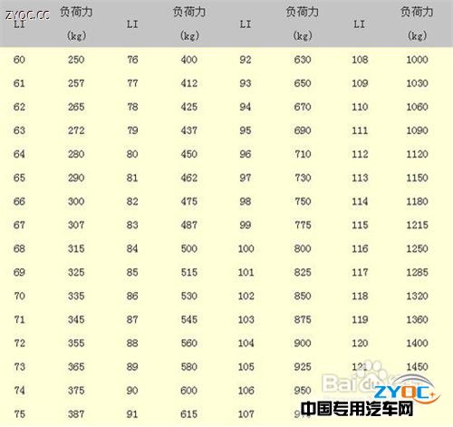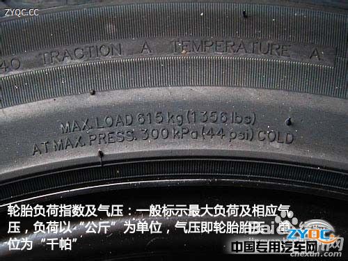 一般標(biāo)示最大負(fù)荷及相應(yīng)氣壓,負(fù)荷以“公斤”為單位,氣壓即輪胎胎壓,單位為“千帕”。