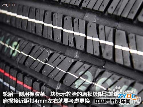 輪胎一側(cè)用橡膠條、塊標(biāo)示輪胎的磨損極限,輪胎磨損接近距其4mm左右就要考慮更換。
