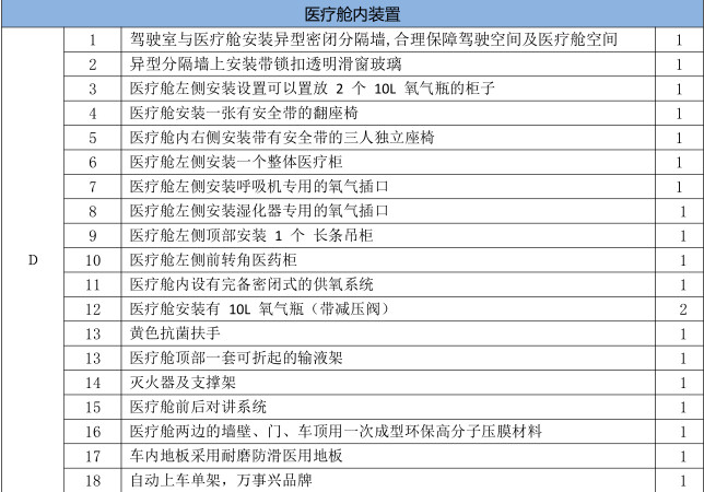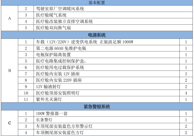 | 其它 | 選裝不同形式的頂部,及警燈、前額凸臺(tái)位置變化,前額凸臺(tái)選裝LED屏。分別對應(yīng)的高度為mm:2580、2810、2590、2360、2690。選裝車頂四周單個(gè)或多個(gè)爆閃燈。選裝換氣扇、側(cè)踏板、裝備醫(yī)療器械柜、氧氣瓶、擔(dān)架、輸液夾持器、消毒燈等專用裝置。選裝普通款大燈??砂凑沼脩粜袠I(yè)要求噴涂或粘貼車輛外標(biāo)識(shí)及裝飾條。選裝的ABS系統(tǒng)生產(chǎn)廠家、型號(hào)分別為博世汽車部件(蘇州)有限公司、6C11 2M110 A*。 | ||