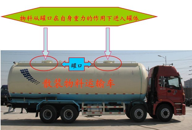 1、湖北程力粉粒物料運(yùn)輸車(散裝水泥車)的裝料原理: